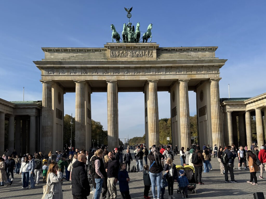 Near the memorial stands the Brandenburg Gate, one of Berlin’s most photographed and historically significant sites. I’d seen it in films and documentaries, including Reagan’s “tear down this wall” speech, but walking through it felt monumental.