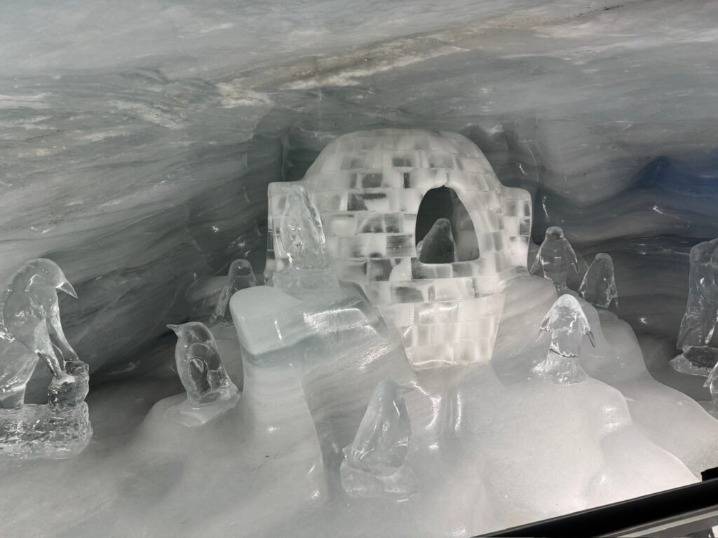 Carved into the glacier, it’s a complex of tunnels with slick floors and sculpted ice art.