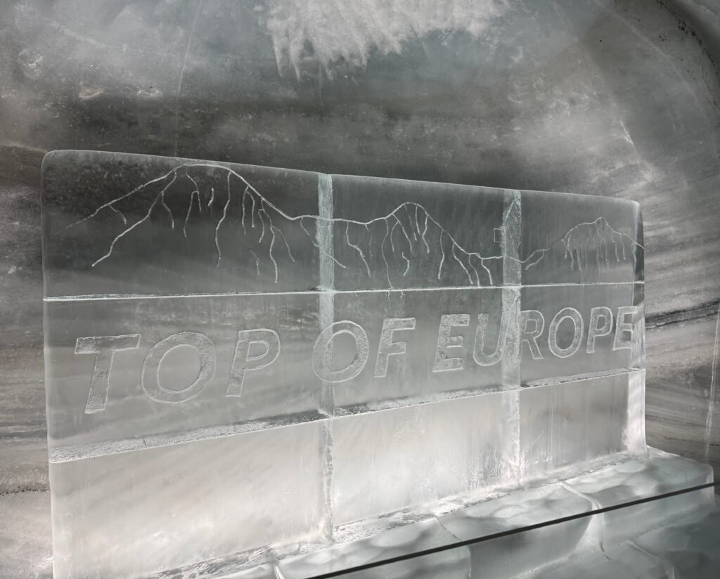Halfway up, the train halts at Eismeer, the “Sea of Ice.” You step into a tunnel and peer through windows at a glacier, It feels like peering into another world.